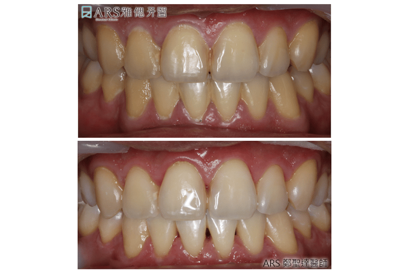 冷光美白療程前後對比,可去除色素沈積導致的牙齒黃