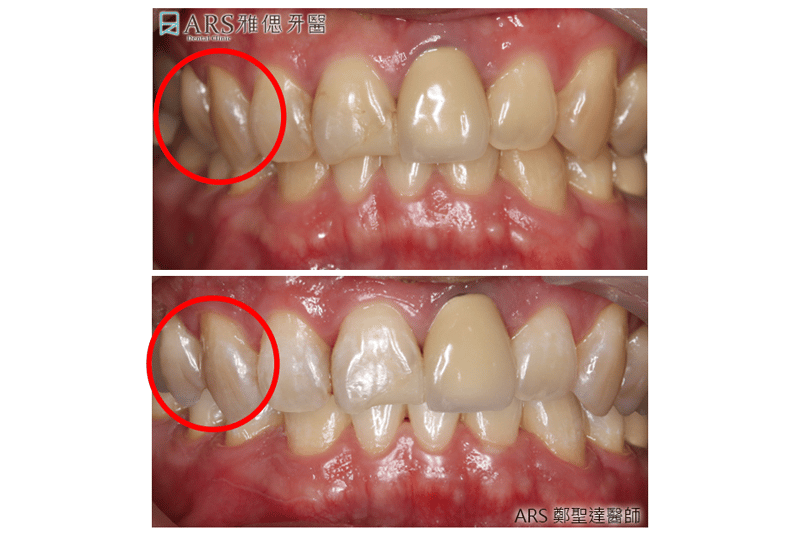 • 脫鈣位置於冷光牙齒美白後會有些微脫水現象,看起來更白了一些,水分約於2周後吸收回去,呈色上會接近原來脫鈣顏色